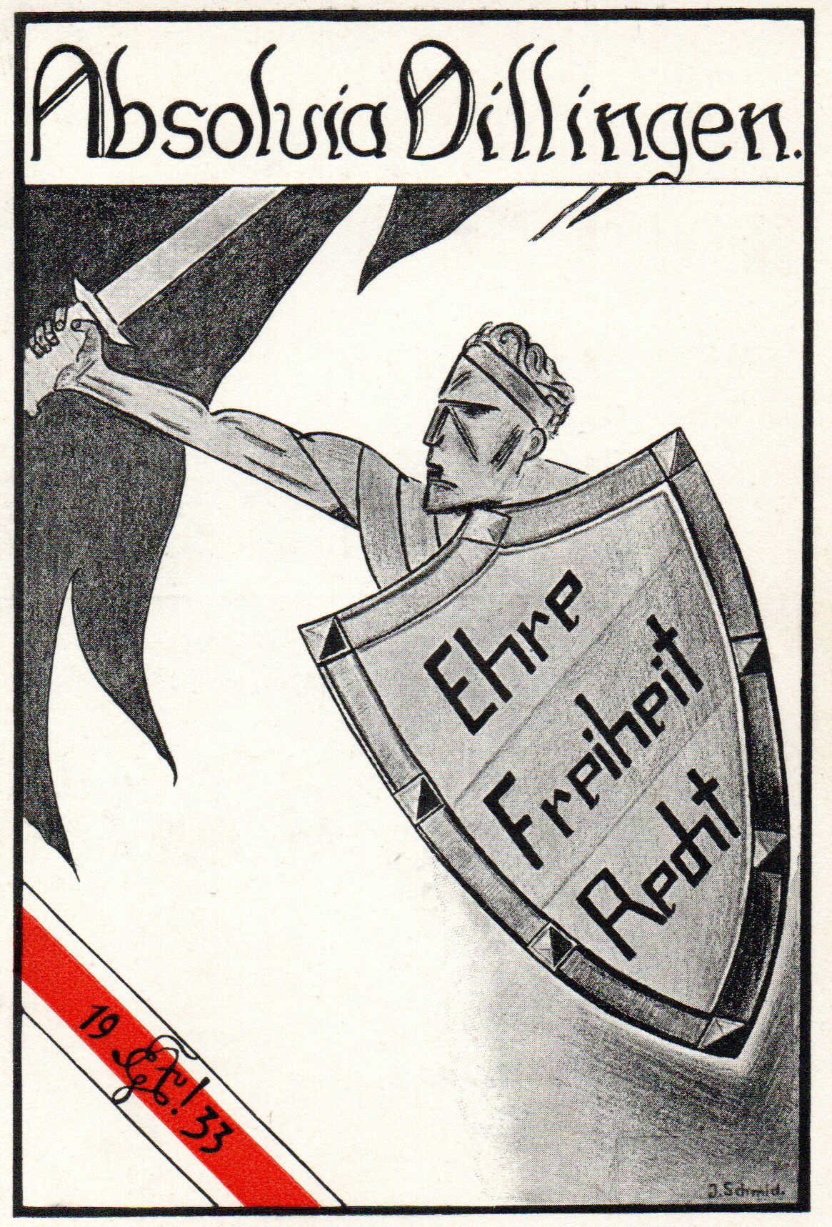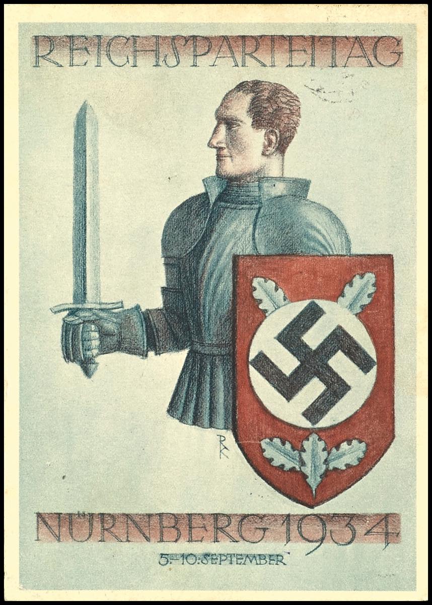 Die rot-weiße Absolvia-Karte von 1933 und das Plakat des Reichsparteitags 1934 verwenden die gleiche Grundidee: der Oberkörper einer männlichen Figur, den Schild in der linken Hand, das hoch