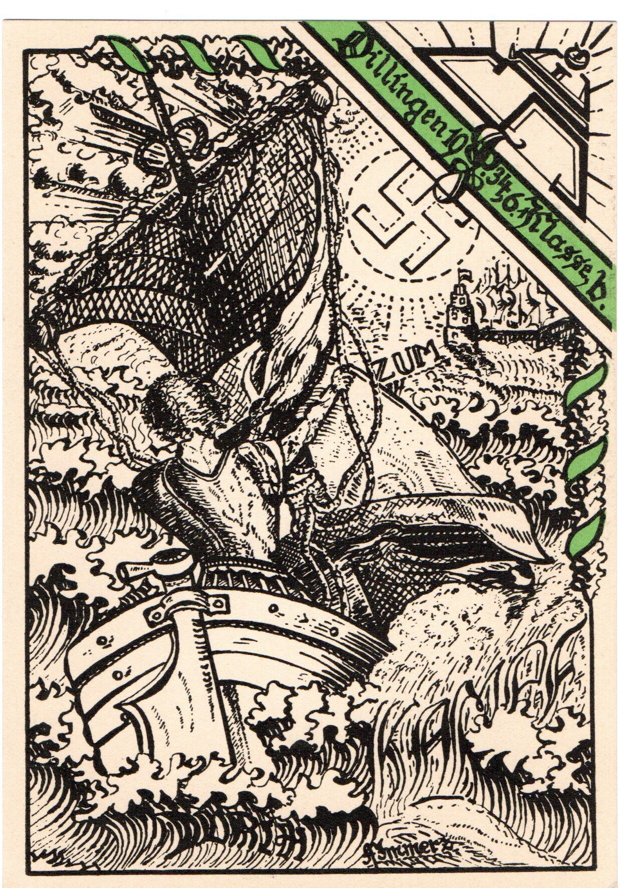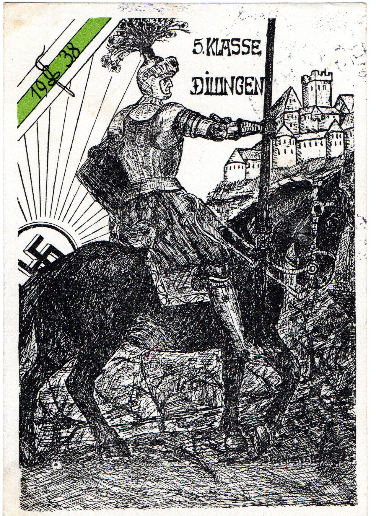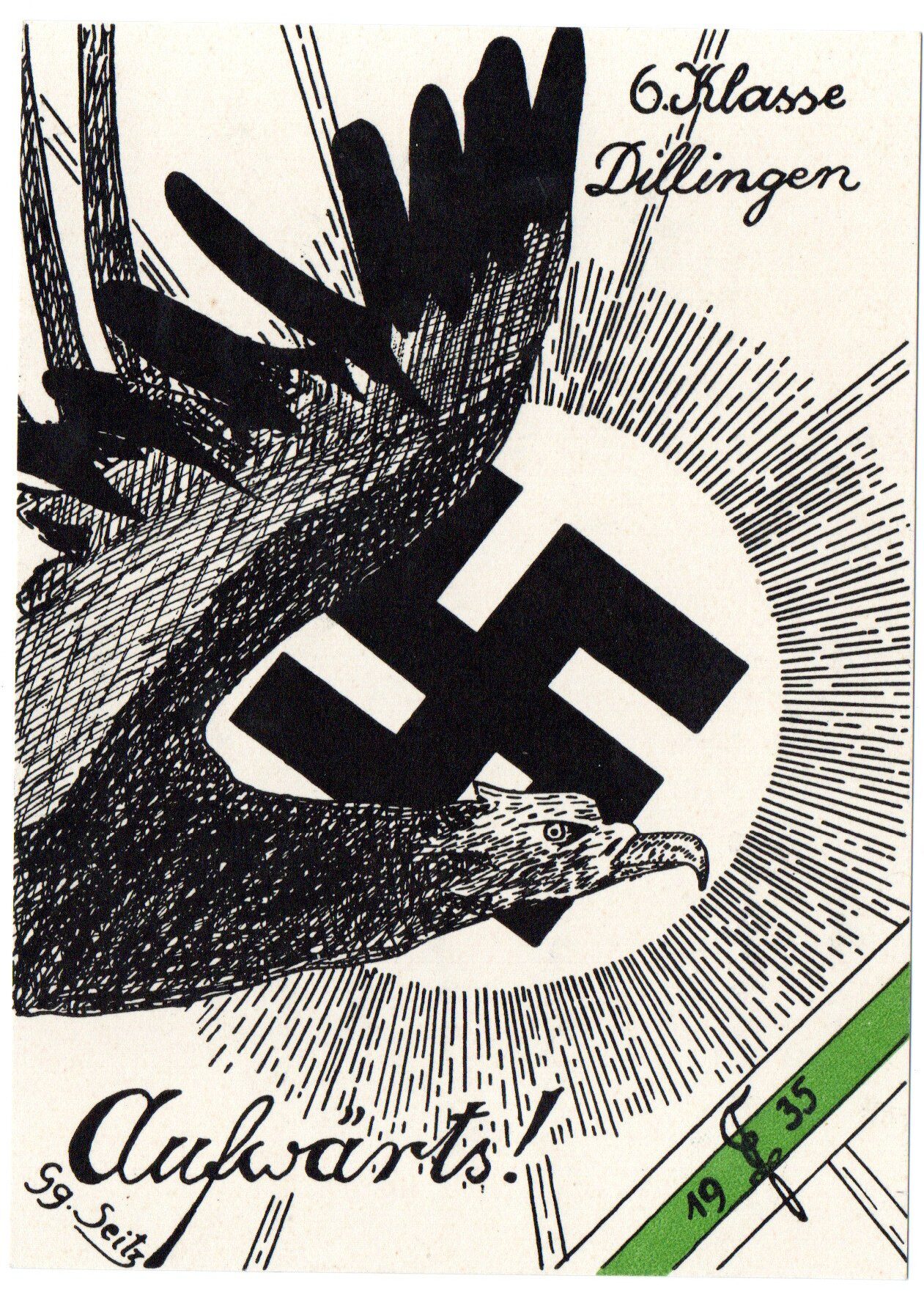 Eine besondere Quelle, um den Mentalitäten auf die Spur zu kommen, die während der Nazizeit am Gymnasium anzutreffen waren, sind die Absolvia-Karten, also die anläßlich eines Schulabschlusses gedruckten Postkarten. Dabei sind die mit einem grün-weißen Band verzierten Karten dem „kleinen Abitur“ nach der 6. (heute 10.) Klasse gewidmet, also der Mittleren Reife. Sie markieren einen Zwischenschritt auf dem Weg zum Abitur.[37] Diesem waren Karten mit rot-weißem Band vorbehalten. Die Dillinger Absolvia-Karten sind, wie alle Artefakte, immer auch Indikatoren für zeitbedingte Einstellungen, Ideale, Moden, Haltungen und Bekenntnisse vergangener Generationen. Es fällt auf, dass in den Friedensjahren nach der Machtübernahme 1933 Absolvia-Karten auftauchen, die Motive von nationalsozialistischen Propagandapostkarten übernehmen. So zeigen die Absolvia-Karten für mittlere Reife aus den Jahren 1934, 1935 und 1938 das Hakenkreuz in Mitten einer aufgehenden, strahlenden Sonne.