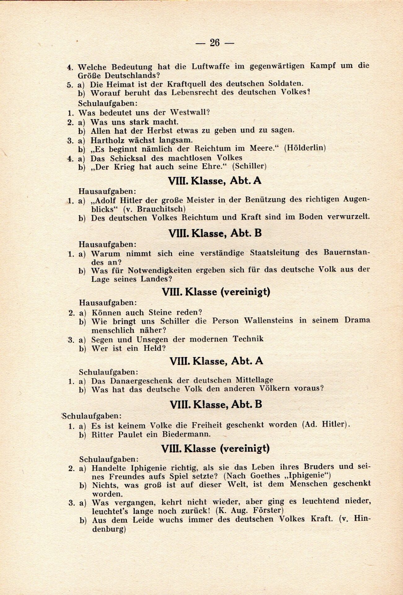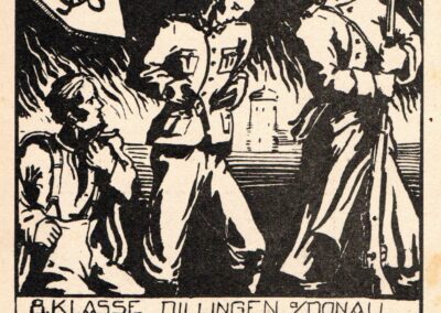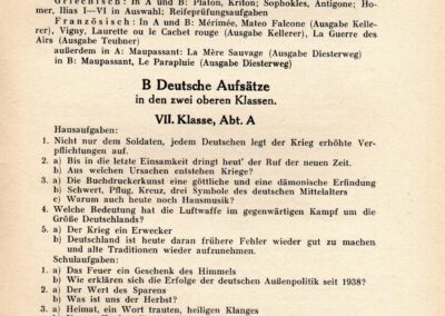 „… auf deren Vorderseite stand ‚Und setzet ihr nicht das Leben ein, nie wird euch das Leben gewonnen sein. Schiller‘. Ich weiß nicht, wer auf den heroischen Spruch kam, aber er paßte in die Zeit und war als Zitat ein Erzeugnis des Zeitgeistes. Auch stand noch da: ‚Absolvia 1944. Dillingen/Donau‘. Auf der Rückseite gab es unsere Unterschriften im Facsimile, eine reife Leistung deutscher Druckerkunst. Unterzeichnet hatten unsere drei Mädchen und wir drei Schüler, die noch nicht achtzehn Jahre alt waren. Die anderen standen längst beim Militär.“[21]