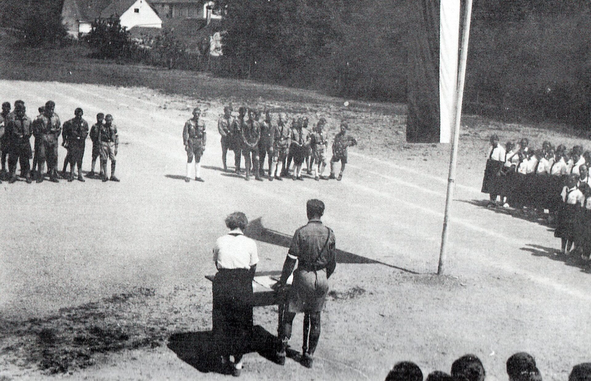 Zu Beginn des Schuljahres fand auf der Königstraße eine Art Appell statt Da wurde die Straße gesperrt, wir traten an, und Herr Schröttle[11]ließ alles stillstehen, um dem Rektor[12] Meldung zu machen. Dabei hoben beide die Hand zum Deutschen Gruß […] Dann hielt der Rex seine Rede, die mit dem Gruß „an unseren Führer“, der Flaggenhissung und dem obligaten dreifachen „Sieg Heil“ endete. Dann kamen noch Deutschland- und Horst-Wessellied.[13]